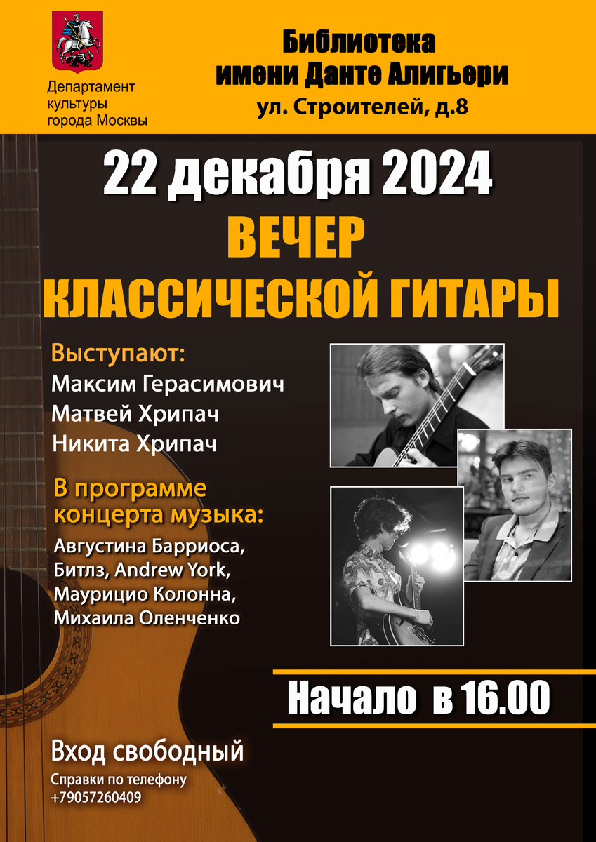 Программа концерта Максим Герасимович ДДТ, "это все" "что такое осень" 2. Dilermando Reiss вальс "она уходит " 3. Avgustin Barrios suite "la cathedral" Матвей Хрипач 1. Cris Isaac "wicked game " 2. Михаил Оленченко старинная медленная 3. Жозеф Косма вариации на тему "осенние листья" 4. Хулио Цезар Олива " я пришел сказать, что люблю" Никита Хрипач 1. Beatles "in my life " 2. Married life from "up" 3. Astor Piazolla "tango triunfal" 4. Михаил Оленченко "Инспирация" #гитара #концерт