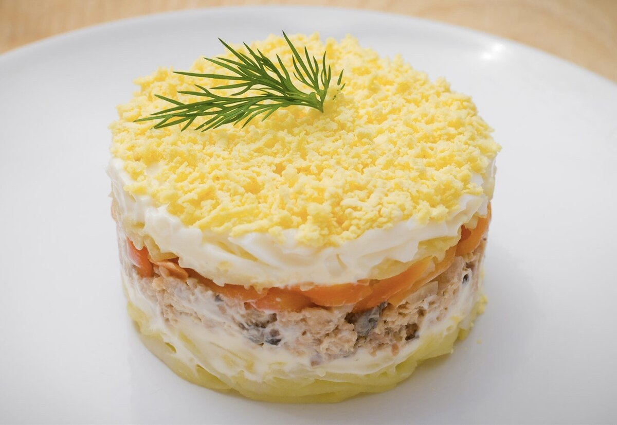 Консервированная горбуша в собственном соку - 200 г Цветная капуста - 200 г Морковь - 1 шт Лук - 50 г Яйца - 4 шт Соль, перец по вкусу Сметана, греческий йогурт или домашний майонез из 3 вариантов: Рыба, капуста с луком, морковь, белки, желтки сверху. Между слоями мазать майонезом, сметаной или йогуртом. Приятного аппетита! КБЖУ салата без заправки на 100 грамм: белки -10.24 г, жиры -4.9 г , углеводы -3.04г, калории - 97.47 ккал. КБЖУ майонезов в статье с майонезами.
