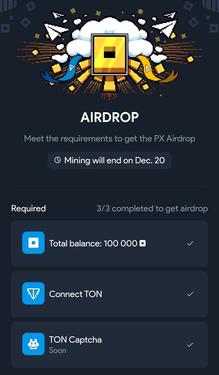 ✅ Как его выполнить: 1) Зайти в раздел airdrop, нажать на задание с 2) Подключить кошелёк 3) Отправить 0,1 TON 4) Полная статья здесь. 5) Полная статья здесь. 6) Полная статья здесь. ☝️Сервера могут тормозить. Мне пришел код минут через 15 после отправления 0,1 TON. Поэтому ждите, не паникуйте. 🔥Еще сейчас работает акция, которая дает возможность найти Ton или NOT, перекрашивая пиксели. Я уже потратил на покраску 350 молний, ничего не нашел. В планах потратить еще более 500. 👉Заходите к нам в чат, будем делиться результатами турнира👈