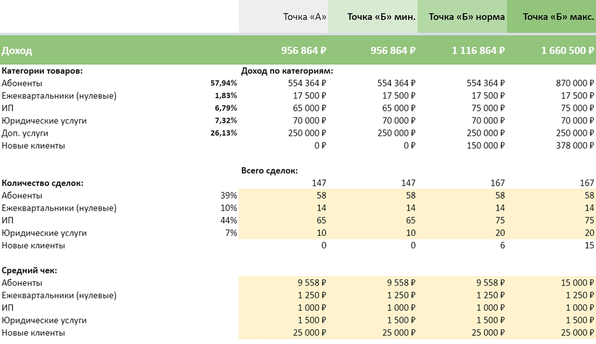 Вот пример декомпозиции продаж в компании по бухгалтерскому аутсорсингу. На примере 4 разреза: точка «А» (что сейчас) и три точки «Б» (минимум, норма и максимум):