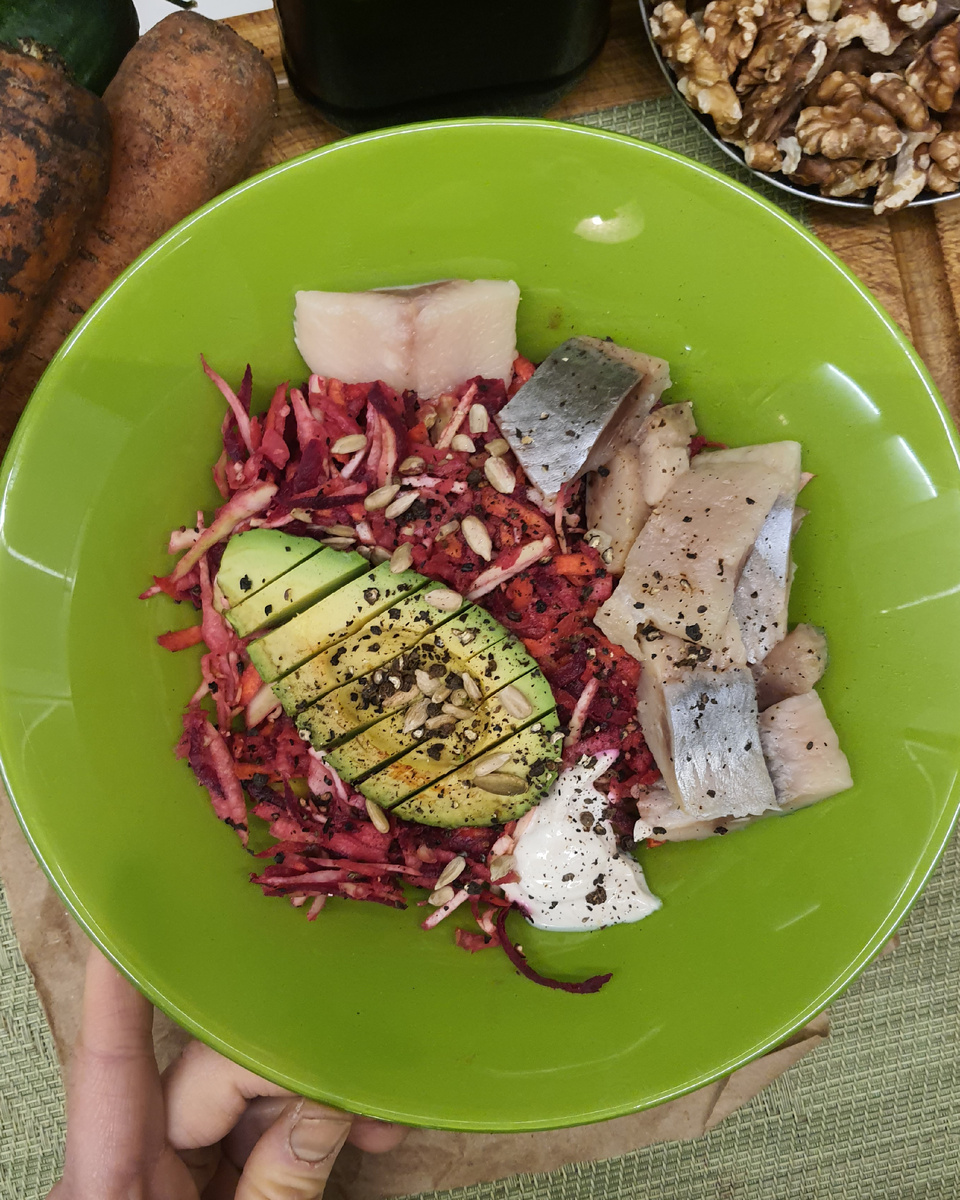 5. Тушеная капуста с фаршем (тунец) и авокадо