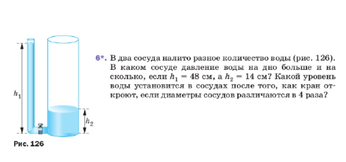 Задача из учебника физики для 7 класса, Пёрышкин, Иванов, 2023 г. Ответ на второй вопрос задачи: При открытии крана сосуды будут сообщающимися, вода из левого сосуда начнёт переливаться в правый сосуд до тех пор пока уровни жидкостей в обоих сосудах не станут равными. Учителя математики, на ваш взгляд, ученик 7 класса обычной школы способен самостоятельно проделать такие математические выкладки?