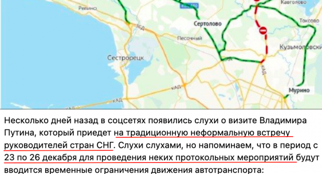 Трассу «Сортавала» от «Меги» до деревни Иваново и половину КАД - от развязки в Парголово до развязки с Ропшинским шоссе - закрывают на три дня, с 24 по 26 декабря. На сайте ФКУ Упрдор «Северо-Запад сказано невнятно: вводится «временное ограничение движения для грузовых автомобилей; также запланированы полные перекрытия движения для всех видов транспортных средств». Ведомство пытается успокоить водителей: «Для регулирования движения будут привлечены патрульные экипажи ГАИ. Информация об ограничениях будет выведена на табло». Но вообще водителям советуют «воздержаться от движения по указанным участкам дорог и использовать альтернативные маршруты». На сайте правительства ЛО советуют ехать в область или по Выборгскому, или по Старо-Приозерскому шоссе. Из области в Петербург: из Сосново и Снегиревки - до Новоприозерского шоссе в направлении Первомайского и затем по «Скандинавии» в сторону Сертолово; из Запорожского - через Гарболово и Лесколово до Кузьмоловского и Мурино; из Мичуринского и