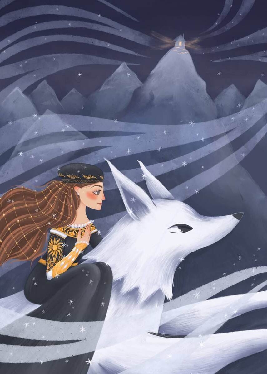 Йола усердно помолилась и, оседлав белую лошадку Снежку, под покоровом ночи тихо ускользнула из замка. Впереди бежал маленький голубоглазый волк, указывая путь. Так они и двигались – всё дальше от родного дома, в неизведанность края вечных снегов и льдов.