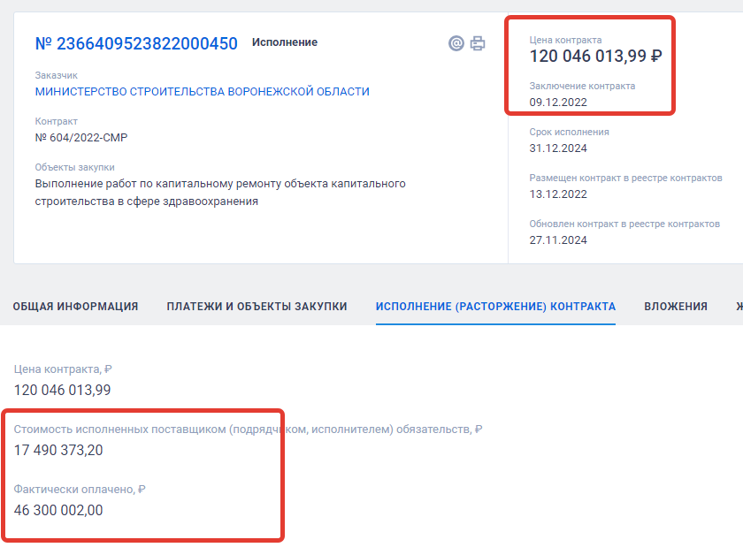 скриншот сайта госзакупок, карточка исполнения госконтракта по капремонту Грибановской райбольницы