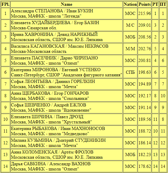 Очень легко, но вместе с тем "строго" выглядели на льду Милана Кузьмина/Дмитрий Студеникин (186.14 - 12 место). Исключительно техничный прокат, с постоянным усилением атмосферы внутри него по мере приближения концовки. Как итог - лучшие баллы в еще только начинающейся взрослой карьере. Лиза Шичина/Павел Дрозд (189.56 - 10 место) снова были необыкновенно хороши в образах "Самсона и Далилы", выделяясь среди всех других пар, и при этом практически безупречны технически, естественно не без судейских замечаний. Немного не дотянули до 190 баллов, которые они уже получали на этапах Гран-при, но в итоге все же смогли подняться на одну ступеньку после ритм-танца и войти в Топ-10.