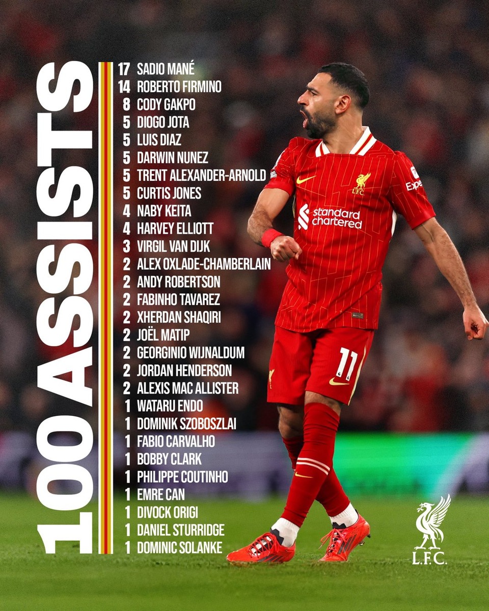 В список игроков «Ливерпуля», которые забивали с помощью египтянина, попали его нынешние одноклубники: Коди Гакпо, Диогу Жота, Луис Диас, Дарвин Нуньес, Трент Александер-Арнолд, Кертис Джонс, Харви Эллиотт, Вирджил Ван Дейк, Энди Робертсон, Алексис Мак Аллистер, Ватару Эндо и Доминик Собослаи.