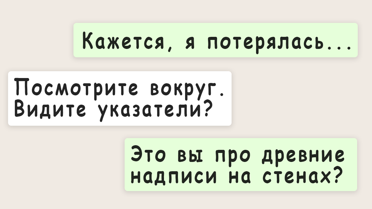 Я обернулась — группы не было. Гид с туристами успели уйти далеко вперед, оставив меня одну среди каменных стен. У меня возникло сразу же много разных эмоций и мыслей. Я начала громко звать людей, но в ответ — эхо! Смотрю назад: пару фонариков, а за ними — темнота. Да кто вообще придумал в первый же день отправлять туристов, которые даже по навигатору в другом городе ориентироваться не могут, в настоящую пещеру?! Решила пройти пару шагов, может, голос услышу. Но, как говорится: чем дальше в лес, тем больше дров… Мой телефон, по привычке, был выключен в отпуске, но, к счастью, интернет работал. Я быстро нашла в мессенджере номер гида, выданный в начале тура, и начала писать.