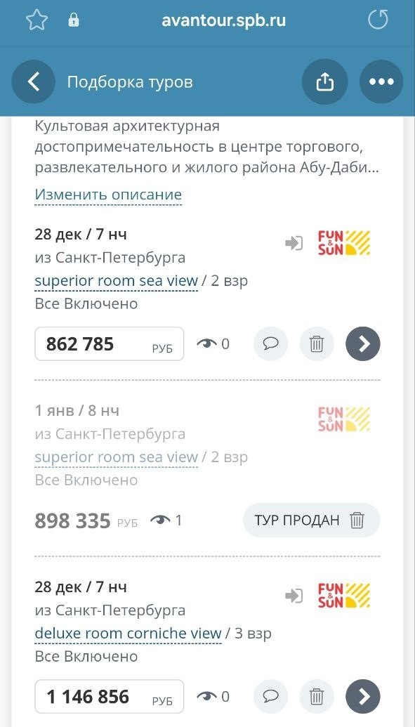 Постоянная клиентка пришла с запросом на новогодний отдых в ОАЭ. Попросила посмотреть отель 5* на 8 дней с 29 декабря для троих или с 1-2 января для двоих на 8 дней. Выбрали Rixos Marina Abu Dhabi 5* и вот что увидели: Ответ от клиентки пришел очень быстро и оказался предсказуем: Тот же отель с 12 января на 7 ночей, «всё включено» для двоих 427,5 тысяч (цена в конце ноября). Сейчас стоимость от 438 тысяч. Конечно, Новый год самый яркий пример игры ценами. Но и в другие праздники наблюдается такая же тенденция. Когда массовый наплыв туристов, цены бегут вверх. Иногда можно сдвинуть даты всего на несколько дней, и будет совсем другая картина и экономия семейного бюджета. Не всегда проблемы возникают из-за отелей. Есть периоды в течение года, когда вопрос в количестве мест на чартерах. Например, в начале осенних каникул (24-25 октября в этом году), когда туристы массово полетели на отдых (можно было найти билеты на регулярных рейсах, но стоимость доходила до половины цены самого тура). Ил
