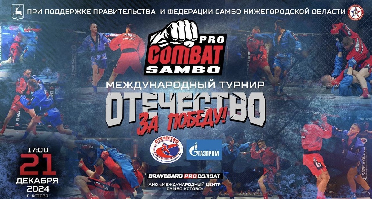 21 декабря в Кстове в Международном центре самбо состоится второй международный турнир серии PRO COMBAT SAMBO «Отечество за Победу!» по профессиональной версии национального вида боевого единоборства самбо. В соревновательный профессиональный октагон выйдут представители 10 стран из Европы, Азии и Африки. Организаторами турнира «Отечество за Победу!» выступают правительство Нижегородской области, Федерация самбо Нижегородской области, Кстовская федерация самбо и общество развития спортивных единоборств «Отечество». Турнир «Отечество за Победу!» станет продолжением серии турниров, начатых 18 октября 2024 года в Сочи, и планируемых к проведению в 2025 году во многих регионах на территории России. Данной серии предшествовали яркие турниры «Битва чемпионов - Своих не бросаем», «ZA ПОБЕДУ», которые проходили в Кстове в 2022 и 2023 годах. 21 декабря зрителей ожидает бойцовское шоу из 15 профессиональных поединков по утверждённым правилам профессионального боевого самбо, бои пройдут в октагон
