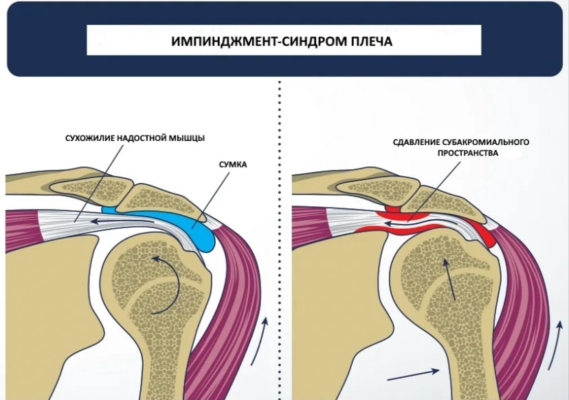 Импинджмент-синдром (синдром импинджмента) — это состояние, характеризующееся сдавливанием (импинджментом) мягких тканей плечевого сустава, таких как сухожилия вращающей манжеты, поддельтовидная сумка и длинная головка бицепса. Это приводит к боли и ограничению подвижности плеча. Классификация: I - я степень: формируется отёк, целостность сухожилия сохраняется II - я степень: появляются признаки хронического воспаления. Возможны незначительные надрывы, а также появление остеофитов III - я степень: сформированные остеофиты, что в последствии приводит к полному отрыву сухожилия Основные причины: * Сужение субакромиального пространства: Пространство между акромионом (костной частью лопатки) и головкой плечевой кости сужается из-за различных факторов, таких как: * Костные шпоры (остеофиты): Разрастание костной ткани на акромионе. * Воспаление и отеки: Из-за травмы или воспаления. * Плохая осанка: Сутулость может уменьшить это пространство. * Дегенеративные изменения: Связ