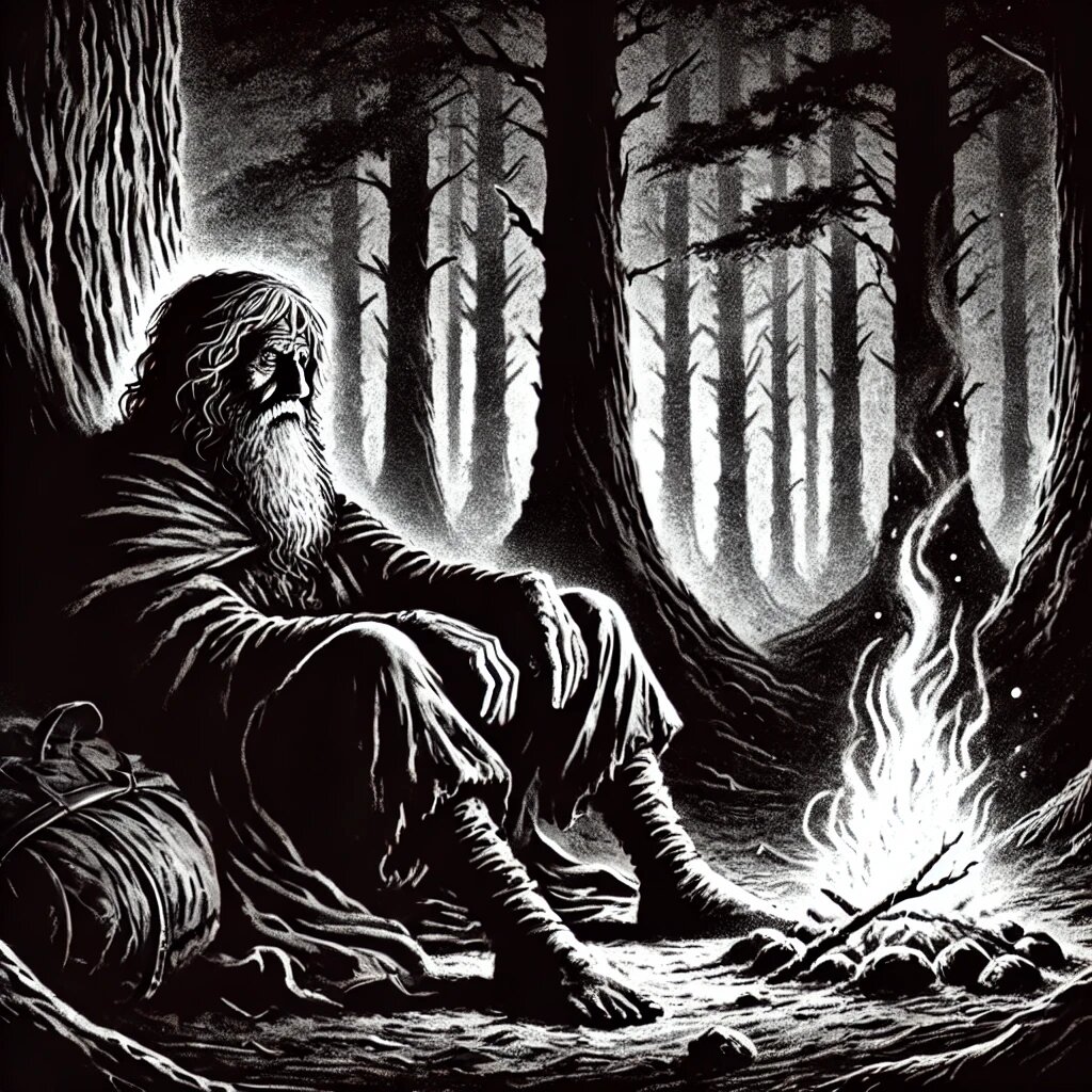 Они развели костёр, собрав хворост, валявшийся неподалёку, и промыли корешки в ручье. Друзья дали старцу лечебные травы, которые он жевал сквозь дремоту, и вскоре тот снова погрузился в тяжёлый сон.