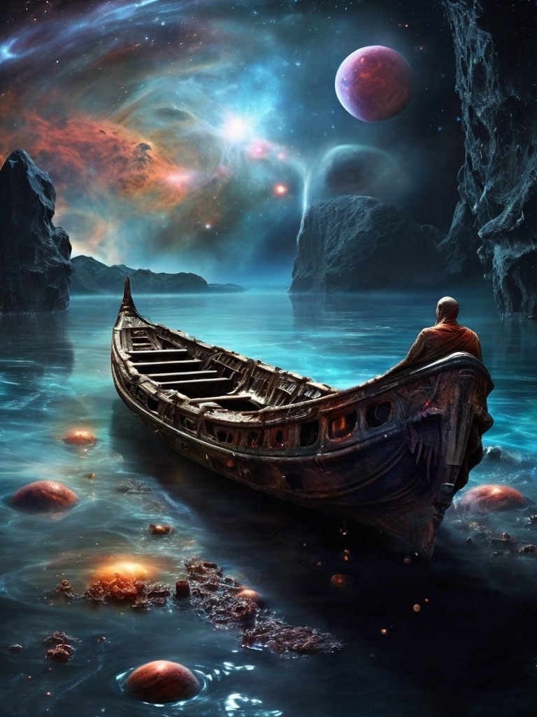 “Одинокая деревянная лодка в мистическом океане, неоновое свечение, космос с яркими звездами, мрачные скалы, яркие планеты на горизонте, атмосферный свет, магический реализм”.