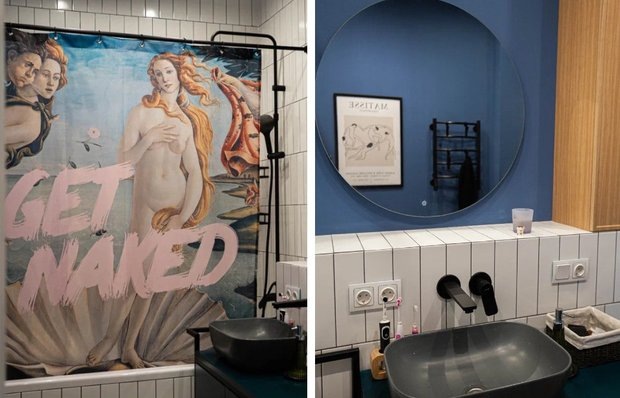 Советы и лайфхаки для создания яркого и функционального пространства В квартире Насти в ЖК «Локомотив» предусмотрено два санузла: просторный мастер-санузел и небольшой хозяйственный. Задача хозяйки — сделать их не просто утилитарными помещениями, а стильными и функциональными пространствами. В результате удалось создать зоны, где каждая деталь продумана до мелочей. Как и во всей квартире, ремонт в санузлах начался с черновых работ: выравнивания стен, укладки плитки и установки сантехники. Для большого санузла Настя выбрала смелую палитру — сочетание синих стен, зеленой тумбы и белой продолговатой плитки. Основным вызовом стало найти подходящую сантехнику. Настя принципиально хотела напольный унитаз черного цвета, что оказалось непростой задачей. Пришлось заказывать его из Казани, но хозяйка довольна, что нашла именно то, что искала. Большой санузел Настя решила оформить в стиле SPA. Синие стены и зеленая тумба создают уютную атмосферу, а белая плитка придает помещению легкость и ритм.