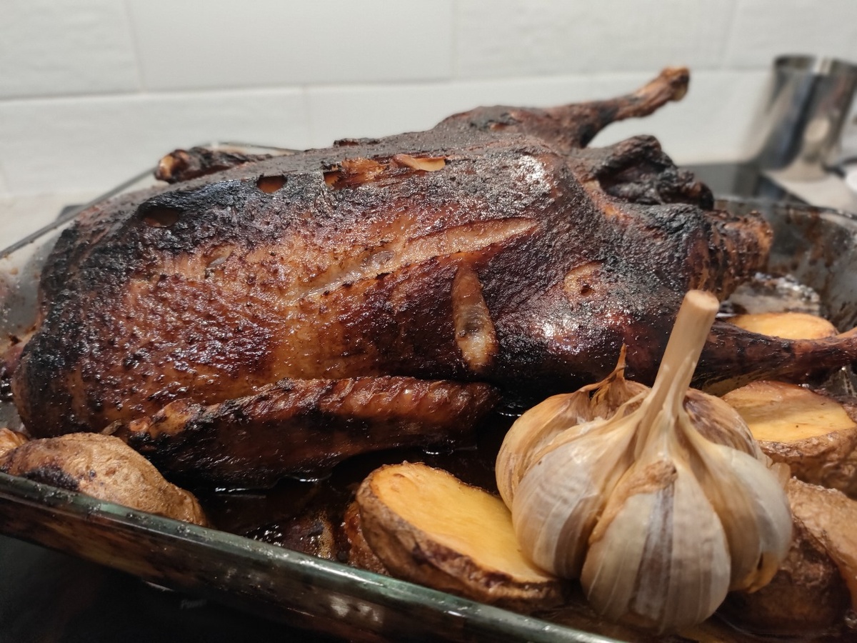 Ингредиенты: небольшая утка – 1,5 кг, чеснок – 4 зубчика, мед – 1 ст. л., зеленое яблоко – 1 шт., мандарины – 2 шт., чернослив – 150 г, соль и черный молотый перец по вкусу.