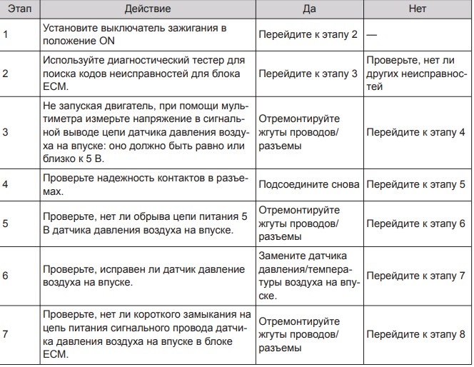 Описание диагностического кода (DTC): короткое замыкание цепи датчика давления воздуха на впуске на цепь питания. Условия появления DTC: напряжение датчика давления воздуха на впуске выше пороговой величины.