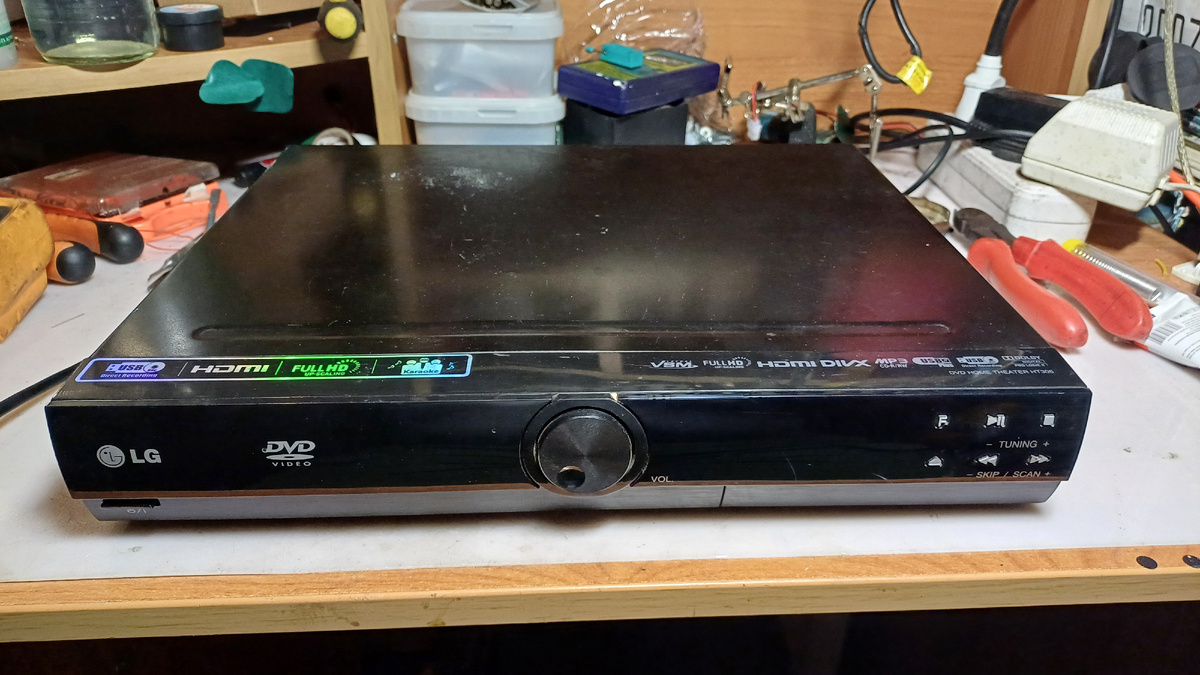 Домашний кинотеатр LG HT306, воспроизводит аудио и видео с CD/DVD, с USB флешки, принимает радиостанции в FM диапазоне, усиливает аудиосигнал со входа AUX. Особенно важно наличие функции караоке. Можно поорать в ночи. Можно было бы, если б аппарат работал. Но в один прекрасный для соседей и не очень прекрасный для владельца день домашний кинотеатр совершил последний выдох господина ПЖ и затих. Хозяин отдал его какому то знакомому мастеру и прождав месяц без внятных результатов, забрал его обратно, предоставив разбираться уже нам. Разбираем.