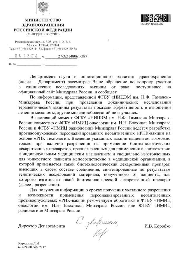 @ @zdravrus @mos.ru @mos-smi.ru У меня рак шейки матки, поэтому меня заинтересовала вакцина от рака, про которую так активно сейчас стали говорить, я направила письмо в Минздрав России с целью более подробно узнать информацию. На данный момент 26декабря 2024года у меня начинается лечение лучевая терапия+химия. Живу я в г. Москва, обследование и лечение проходит в -) Московский многопрофильный клинический центр Коммунарка. ул. Сосенский Стан, 8, стр. 3 Я веду дневник какие анализы и исследования я прохожу/прошла. Прилагаю ответ от Министерства Здравоохранения. Вообщем всё сложно🤦 17декабря 2024 вышла статья: В России начали отбирать добровольцев для участия в первой фазе клинических испытаний вакцины против рака «ЭнтероМикс». Об этом сообщил главный онколог Минздрава РФ и генеральный директор НМИЦ радиологии Андрей Каприн. Начало моей истории: 🚨🚨🚨🚨🚨🚨🚨🚨🚨