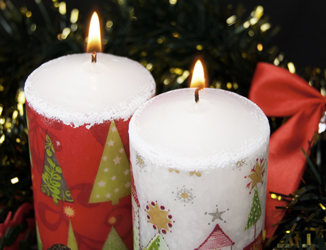 Снимите верхний красочный мотив с салфетки, аккуратно вырежьте его по контуру. Приложите мотив к свече, чтобы убедиться, что он подходит и смотрится гармонично.