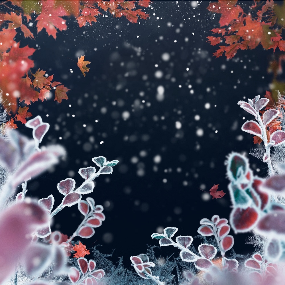 Ночь и снежный ноябрь, на земле лежат осенние листья припорошенные небольшим снежком.