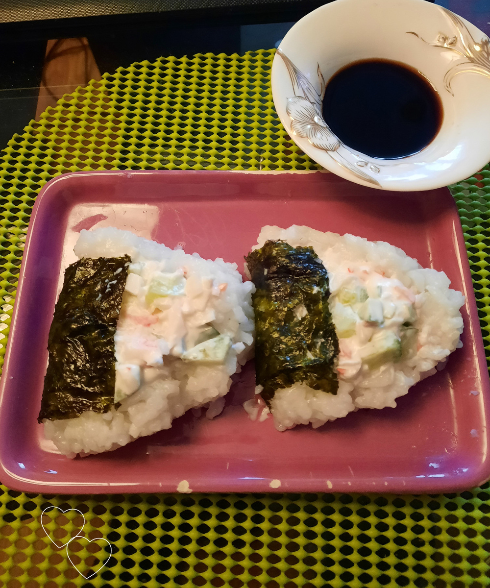 Вы, наверно, замечали: в супермаркетах продаются небольшие рисовые треугольники плотно обернутые листом морской капусты. Давно собиралась сделать дома это японское блюдо с интересным названием онигири. Для основы берется рис, уксус рисовый, листы нори. В качестве начинки можно взять тунец консервированный в собственном соку, вареное яйцо, мягкий сыр, авокадо, свежий огурец, любую красную рыбу из лососевых, креветки, крабовые палочки. Для домашнего приготовления онигири понадобится: В начинку я беру крабовые палочки, немного майонеза и творожного сыра с зеленью, свежий огурец. ✅️ Поставить варить рис. Обычным способом, до полной готовности. В классическом рецепте рис не солят. Добавляют потом по щепотке сахара и соли. Для нас это слишком непривычно по вкусу, потому чуть присолила при варке. ✅️Пока варится рис, приготовим начинку. Я мелко порезала крабовые палочки и свежий огурец. Майонез, 1 столовую ложку, смешала с полной столовой ложкой творожного сыра. Перемешала с крабовыми палочк