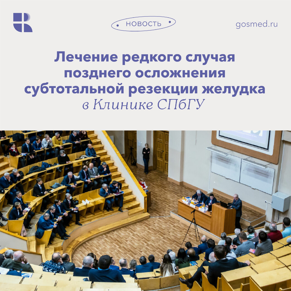 В Санкт-Петербурге состоялось очередное заседание Хирургического общества Пирогова, которое существует уже более 140 лет и регулярно собирает ведущих хирургов города для обсуждения уникальных, наиболее сложных и показательных случаев оперативного лечения пациентов.В Санкт-Петербурге состоялось очередное заседание Хирургического общества Пирогова, которое существует уже более 140 лет и регулярно собирает ведущих хирургов города для обсуждения уникальных, наиболее сложных и показательных случаев оперативного лечения пациентов. Врач-хирург онкологического отделения №2 Клиники высоких медицинских технологий им. Н.И. Пирогова СПбГУ, к.м.н. Светлана Непомнящая представила на заседании редкий случай позднего осложнения субтотальной резекции желудка и результаты его успешного хирургического лечения в Клинике СПбГУ. За медицинской помощью в Клинику обратился пациент 63 лет, которому двадцать лет назад была выполнена операция резекции желудка по поводу рака I стадии. В момент обращения пациента