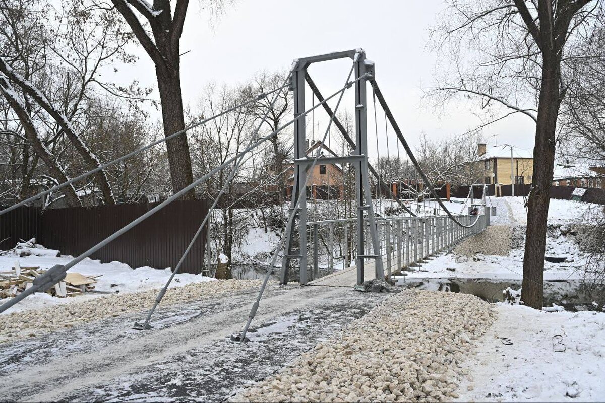Пешеходный мост через реку Рожайку в Константинове открыт после капитального ремонта. За два месяца подрядчиком проведено укрепление существующего пилона на правом берегу, крепление пролетного строения, устройство нового пилона на левом берегу, якорей для оттяжек, новой конструкции прохожей части, пешеходных дорожек к мосту, защита конструкций от коррозии. - Знаем, как этот мост важен для местных жителей, которые переходят по нему через Рожайку из села Константиново в город и обратно, - отметила Евгения Хрусталева, глава городского округа Домодедово. – Он связывает их с торговым центром, автобусной остановкой, школой. С отремонтированным мостом не только вернулась привычная пешая доступность социальных объектов, но и стало комфотрно и безопасно. Информация администрации г.о. Домодедово.