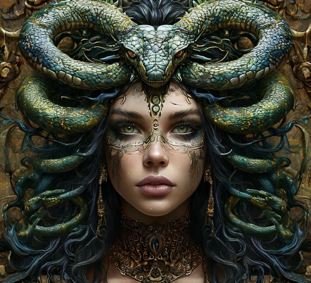 Гнев Афины обрушился на Медузу страшным проклятием, навсегда изменившим её облик и судьбу. Прекрасные золотистые локоны превратились в извивающихся ядовитых змей, кожа покрылась жесткой чешуей, а черты лица исказились до неузнаваемости. Но самым ужасным стал дар, превращавший в камень каждого, кто осмеливался взглянуть ей в глаза.