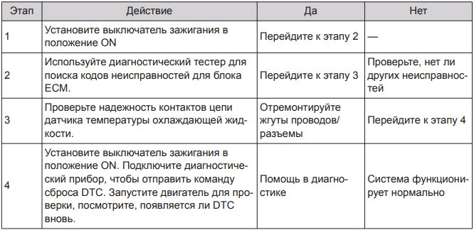 Описание диагностического кода (DTC): некорректное напряжение в цепи датчика температуры охлаждающей жидкости. Условия появления DTC: скачки напряжения на в цепи датчика температуры охлаждающей жидкости.