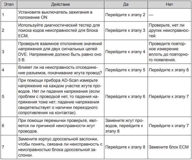 Описание диагностического кода (DTC): недостоверный сигнал в цепях 1/2 электронной дроссельной заслонки. Условия появления DTC: если при сравнении сигнала в первой и второй (5 В) сигнальных цепях электронной дроссельной заслонки обнаруживается отклонение, превышающее пороговое значение, которое подтверждается и по прошествии некоторого времени, то сравните сигнал обеих сигнальных цепей по отдельности с использованием сигнала количества воздуха; если отклонение превышает определенное значение, то цепь, в которой возникает отклонение и через некоторое время, является неисправной. Условия исчезновения кода неисправности: после 40 последовательных циклов прогрева двигателя при отсутствии неисправностей.
