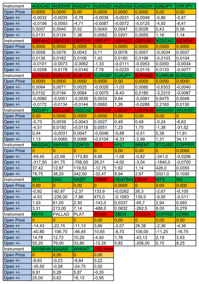 Весь перечень анализируемых активов указан ниже в общем количестве 60 инструментов. Здесь Вы найдете активы рынка Форекс, популярные активы Московской биржи, не менее популярные активы Чикагской биржи СМЕ и мажор криптовалютного сегмента - Биткоин, за которым следуют все альткоины.