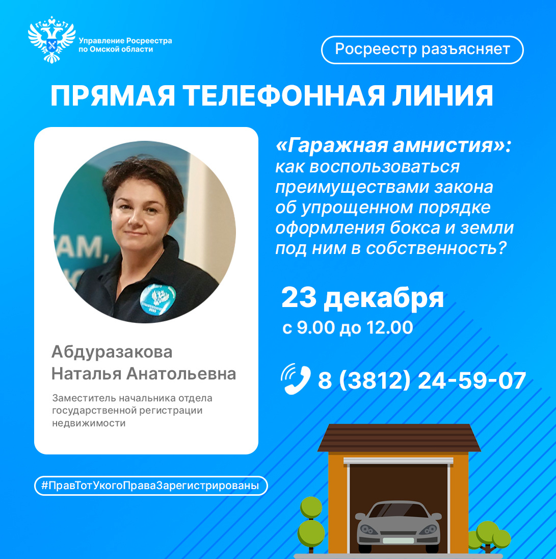 23 декабря с 9.00 до 12.00 в Управлении будет организована прямая линия «Гаражная амнистия»: как воспользоваться преимуществами закона об упрощённом порядке оформления бокса и земли под ним в собственность?» - Что такое «гаражная амнистия»? - Какую недвижимость можно оформить в рамках действия «гаражной амнистии»? - Какие документы необходимы для оформления гаража и (или) земельного участка, на котором он находится? - Куда обращаться, если ваш гараж до сих пор не зарегистрирован? На эти и другие вопросы ответит заместитель начальника отдела государственной регистрации недвижимости Управления Росреестра по Омской области Абдуразакова Наталья Анатольевна по номеру телефона: (3812) 24-59-07. Звоните!