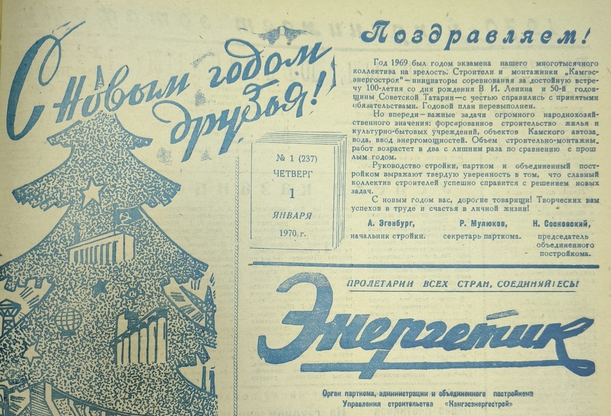Сегодня для вас - новогоднее поздравление, опубликованное в газете «Энергетик» от 1 января 1970 года. Внизу Эгенбург Анисим Вульфович (1915 - 1996) – второй начальник КАМГЭСЭНЕРГОСТРОЯ (1965-1971). Внизу фотографии, сделанные в Набережных Челнах в начале 1970-х годов.
