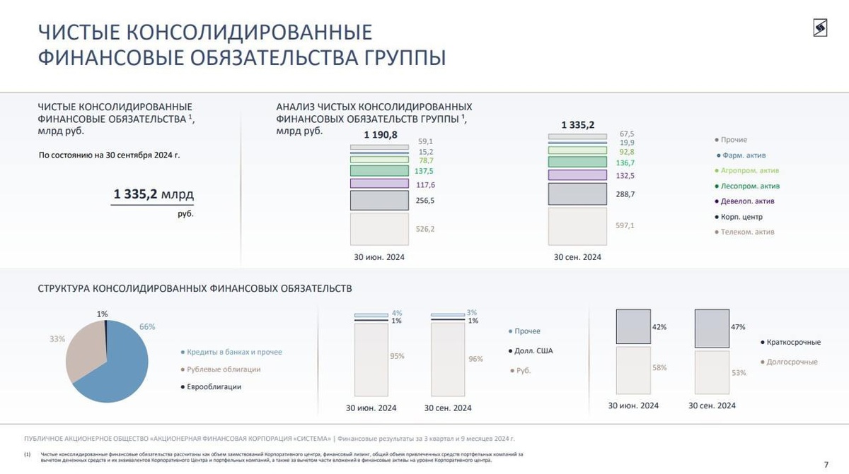Акции компании с мая 2024 года находятся в сильном нисходящем тренде. Прошлый разбор я писал, когда бумаги стояли на отметке 16-17 рублей. Сейчас все гораздо печальнее и «жестче», в прямом смысле этого слова. В этой статье давайте разберем отчет за 9 месяцев 2024 года и оценим уровень этой самой жесткости. Итак, консолидированная выручка холдинга за отчетный период выросла на 20,1% до 888,3 млрд рублей. В 3-м квартале темп роста заметно упал до +12,9%. За квартал лидером по темпам стал Cosmos (+35%), а Эталон лидером по темпам роста OIBDA (+83%). Хотя девелопера, который вступает в кризисный период, я бы сейчас вообще исключил из выборки. Скорректированная OIBDA холдинга за 9 месяцев выросла на 12,6% до 246,4 млрд рублей. Третий квартал был совсем неспешным (+5,4%). Тут мешал штраф от УФАС на МТС на 3 млрд рублей в октябре и общее замедление во всех отраслях на фоне роста ставок. Консолидированная чистая прибыль за 9 месяцев составила 1,8 млрд рублей, едва удержавшись в положительной з