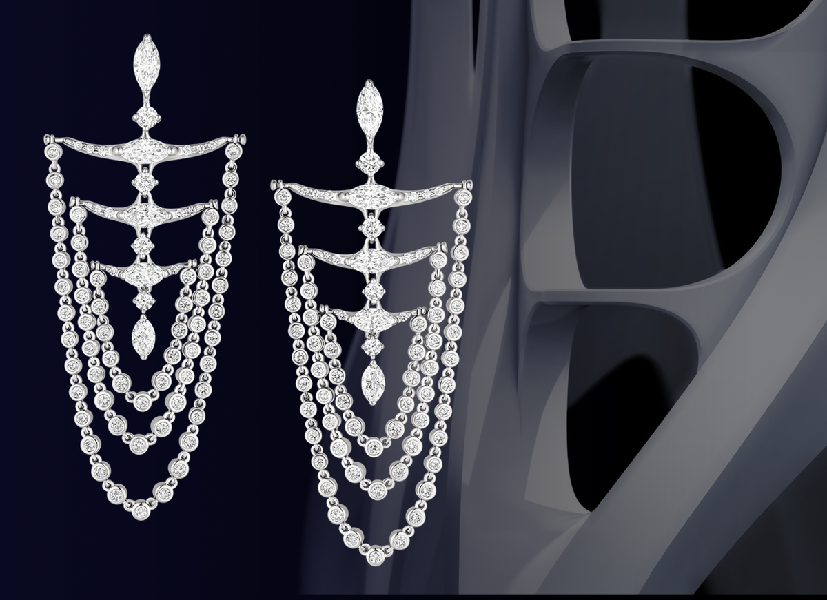 Другие серьги обладают цельной и непрерывной формой, в которой гармонично соединяются эстетика и эргономика. В украшении заключен принцип цикличного движения, вызывающий эмоциональный отклик благодаря сочетанию статики и динамики, четкой геометрии и плавности линий. Такой прием был использован Захой Хадид при оформлении одной из выставочных площадок Манчестера, специально для серии концертов Иоганна Себастьяна Баха. В завораживающем сиянии драгоценных камней особенно притягательно выглядит ряд бриллиантов, ограненных в неожиданной для композиции форме сердца.