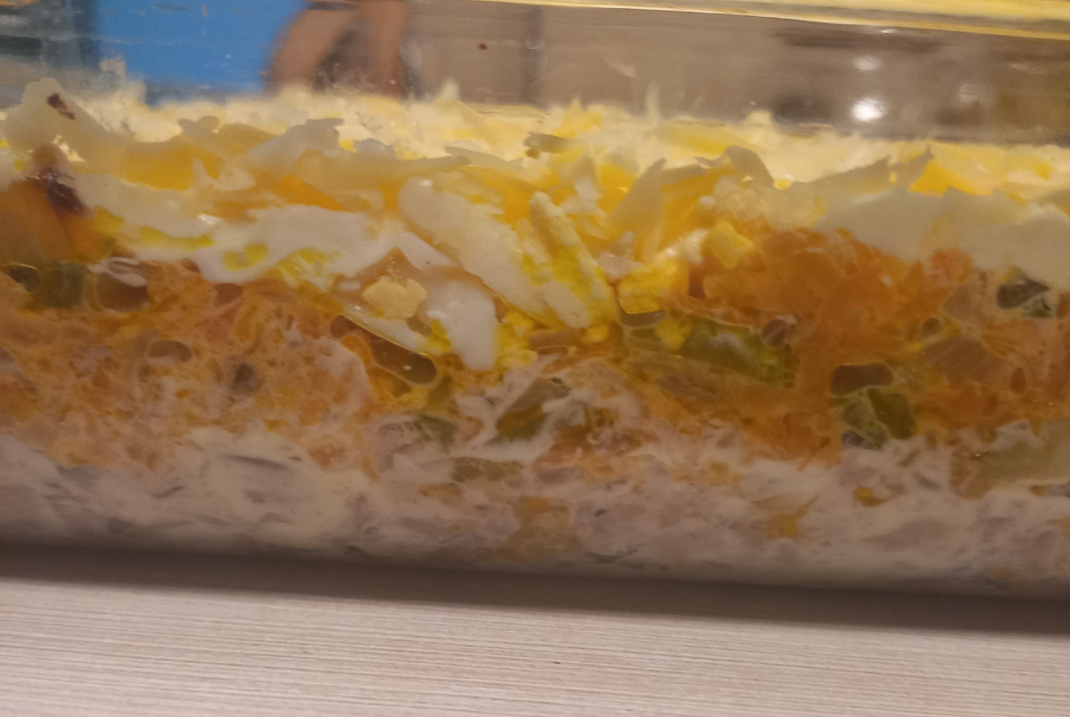 Всем привет! Впереди нас ожидают новогодние праздники, а это значит, что мы много времени будем проводить в кругу семьи, в кругу близких и родных людей. Предлагаю порадовать свою семью и гостей вкусным слоеным салатом из куриной печени. Советую приготовить его заранее, тогда он будет воздушным, нежным и равномерно пропитанным майонезом. Салат очень вкусный и прост в приготовлении. Так же он внесет разнообразие в "салатную классику". Возможно тоже станет частым "гостем" на Ваших столах. Способ приготовления: Куриную печень отвариваем. Расписываю подробно, как сделать, что бы печень получилась нежная. Промываем печень и помещаем в кастрюлю, заливаем холодной водой. Добавляем соль по своему вкусу и для аромата добавляем лавровый лист. Содержимое кастрюли доводим до кипения, уменьшаем нагрев, при варке будет выделяться пена, ее нужно убирать. Варим еще 10 минут и убираем кастрюлю с плиты, оставляем печень в кастрюле (вместе с водой) до полного остывания. Затем печень достаем, выкладыва
