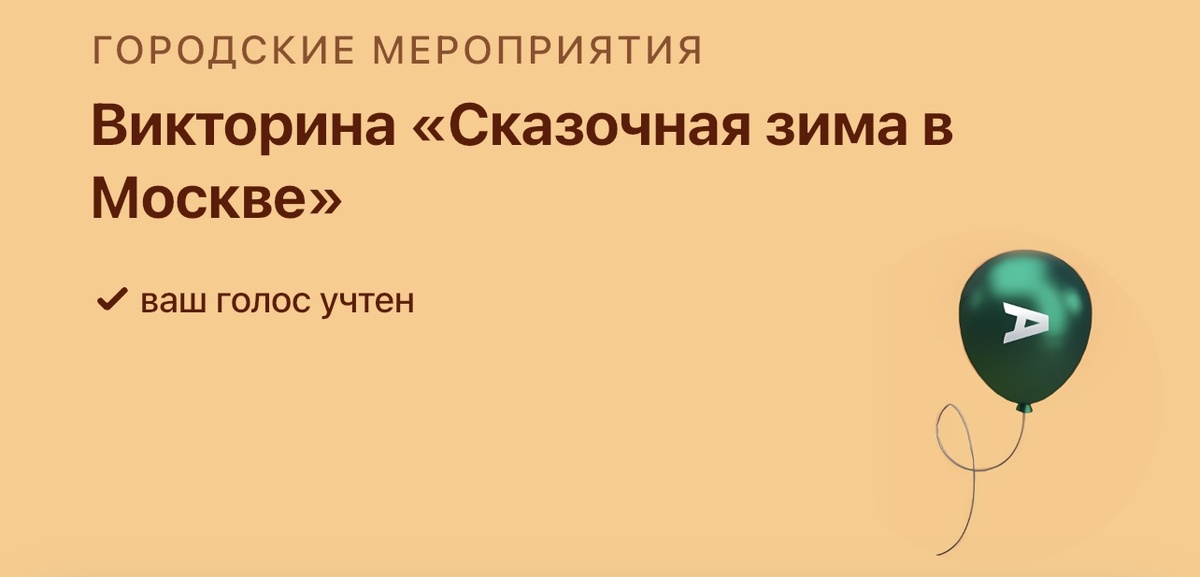 Я принялa участие в голосовании «Викторина «Сказочная зима в Москве»» в проекте «Активный гражданин» https://ag.mos.ru/poll/16713?ref=7t7IxVv3qP 🧊Вопрос 1. Какой вкус московской плюшки считается традиционным? С сахаром 🧊Вопрос 2. Какая городская площадка впервые стала частью фестиваля «Путешествие в Рождество»? Кинопарк «Москино» 🧊Вопрос 3. Какое минимальное количество печатей нужно собрать на квесте «Зимнее путешествие», чтобы получить подарок? 10 печатей 🧊Вопрос 4. Где пройдет выставка дизайнерских елей? На площади напротив ЦУМ 🧊Вопрос 5. Какое лакомство можно попробовать на гастрофестивале «Вкусные морозы»? Пряничный домик 🧊Вопрос 6. Световые проекции с какими героями украшают улицы Москвы на фестивале «Город света»? Все ответы верные 🧊Вопрос 7. Какой скульптуры не будет на фестивале «Снег и лед»? Глыба льда в форме мандарина с возможностью зайти внутрь 🧊Вопрос 8. Сколько скульптур музыкальных инструментов «звучат» в «ледяной» симфонии на фестивале «Снег и лед