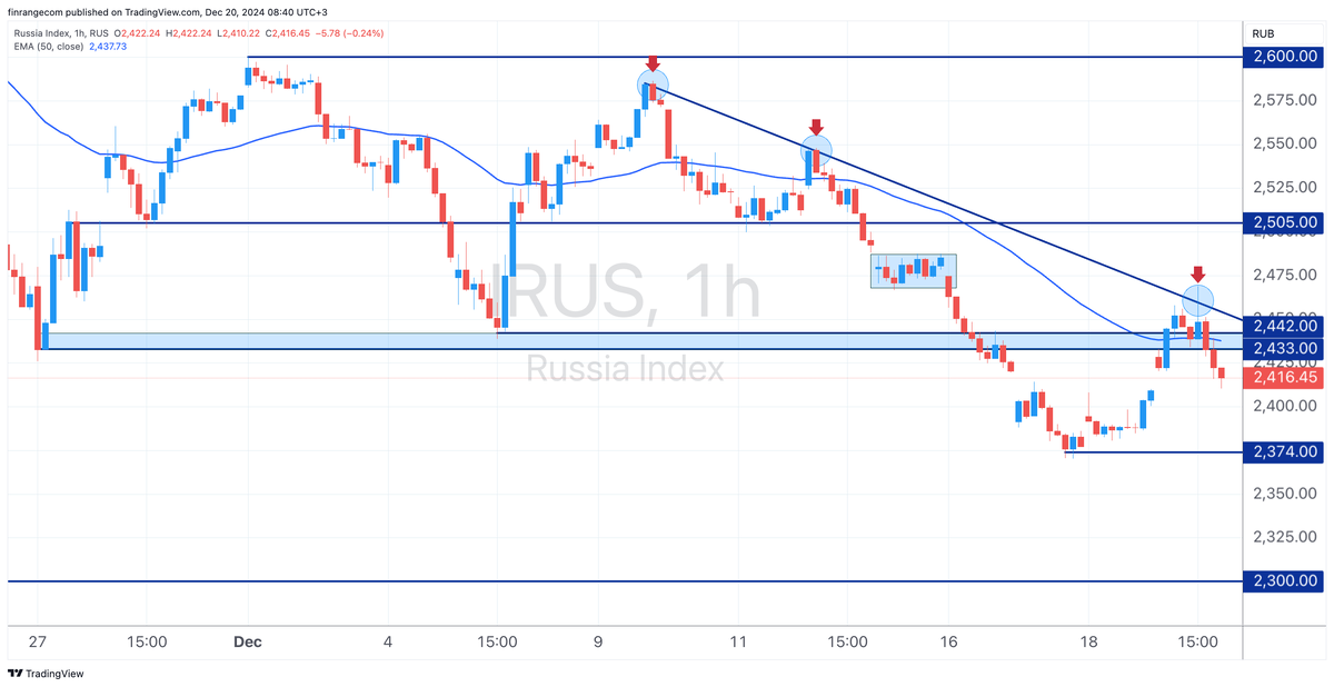 Данный обзор – это моё субъективное виденье рынка, на которое я ставлю свои деньги исходя из моего риск- и мани- менеджмента. Рынок в моменте Отскок после замедления инфляции продолжился с ускорением на выступлении президента России. В середине торгов произошел мощный восходящий импульс с обновлением дневных максимумов. Далее индекс МосБиржи отскочил от локального нисходящего тренда и перешёл к снижению, пробив зону поддержки. Таким образом, сохраняется медвежий тренд. Тем не менее, многие участники расценивают комментарий Путина о действиях ЦБ, как намёк регулятору и позитивный сигнал для рынка. Сегодня в центре внимания заседание ЦБ, где будет принято решение по ключевой ставке. Я склоняюсь к росту ключевой ставке до 23% и жёсткой риторики регулятора. Если ставка будет ниже 23%, мы увидим рост российского рынка. Также, важна риторика ЦБ, при росте ставки до 23% и сигнале о завершении ужесточения денежно-кредитной политике, мы также можем пойти в рост. Всё что выше и жёстче – это уско