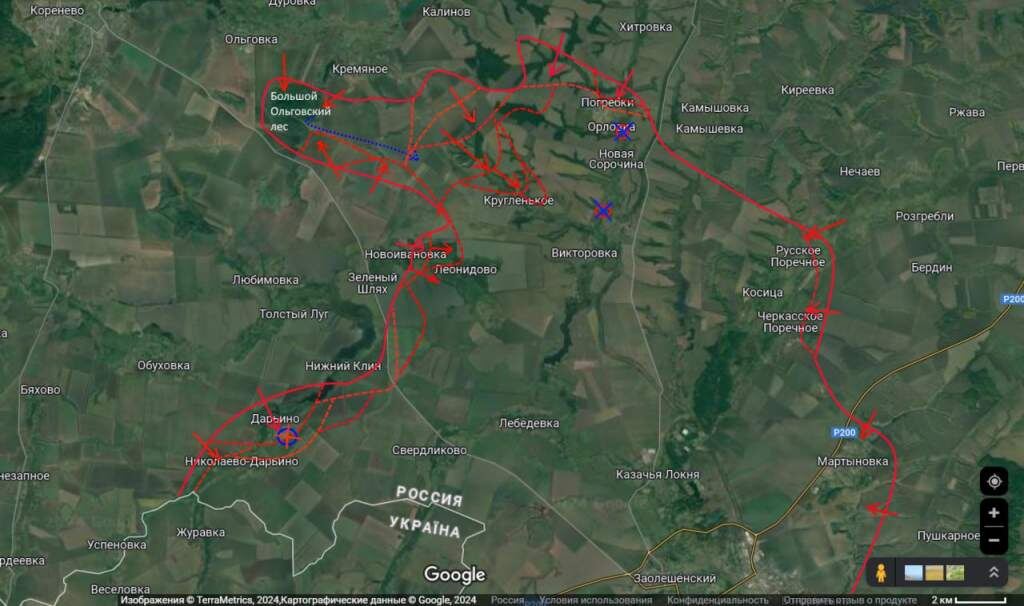 Также уже южнее Суджи продолжаются упорные бои в районе Черкасской Конопельки. Части ВС РФ движутся на север, и сейчас бои ведутся по трассе на Суджи в районе съезда на Махновку. Здесь видно наше намерение охватить город с юга.