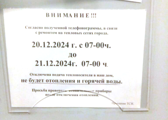 19 декабря 2024 года, в самый морозный день недели, жители некоторых домов города стали получать извещение о том, что с 20 декабря по 21 декабря отключат подачу теплоносителя. Например, детей 39 школы города сегодня отправили на дистанционное обучение, по той же причине. В здании школы не будет отопления и горячей воды. Конечно, жители города возмущены. В паблике «Подслушано во Владимире» выложили комментарии по данной проблеме. Как сообщили в правительстве региона, ночью 20 декабря теплоэнергетики отключили магистральный трубопровод ДУ-800. После чего было определено место повреждения. «В настоящий момент мы приступили к ремонтно-восстановительным работам. Ориентировочное время окончания сварочных работ — 14:00. После чего начнётся заполнение трубопровода теплоносителем. Постараемся сделать всё в максимально сжатые сроки», — прокомментировал ситуацию главный инженер Владимирского филиала ПАО «Т Плюс» Виктор Халёв. Перерасчёт за услугу произведётся жителям автоматически в рамках зак