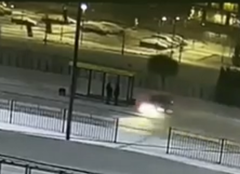 На кадрах видно, что авто влетает в конструкцию боком — машину разворачивает. На остановке в этот момент стоят два человека, но они, к счастью, автомобилем задеты не были.