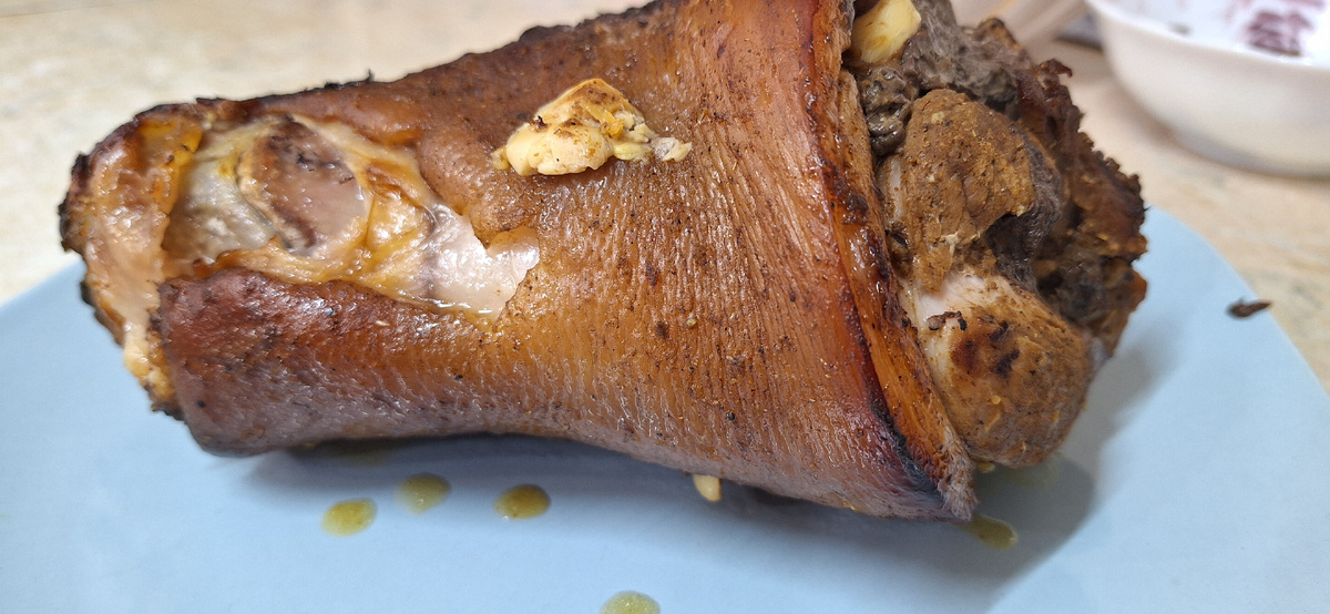 Вот два фото рульки в готовом виде через 1.5 часа. Сверху она хорошенькая, а снизу немного припеклась. Но эта поджареная часть оказалась самой вкусной 😁