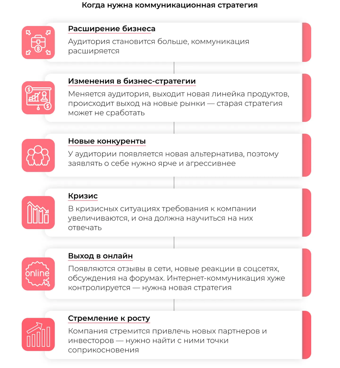 Коммуникационная стратегия становится необходимой, когда количество взаимодействий с аудиторией значительно возрастает. Определить момент, когда стоит приступать к ее разработке, можно исходя из стадии развития бизнеса, рыночной ситуации и обратной связи от клиентов.