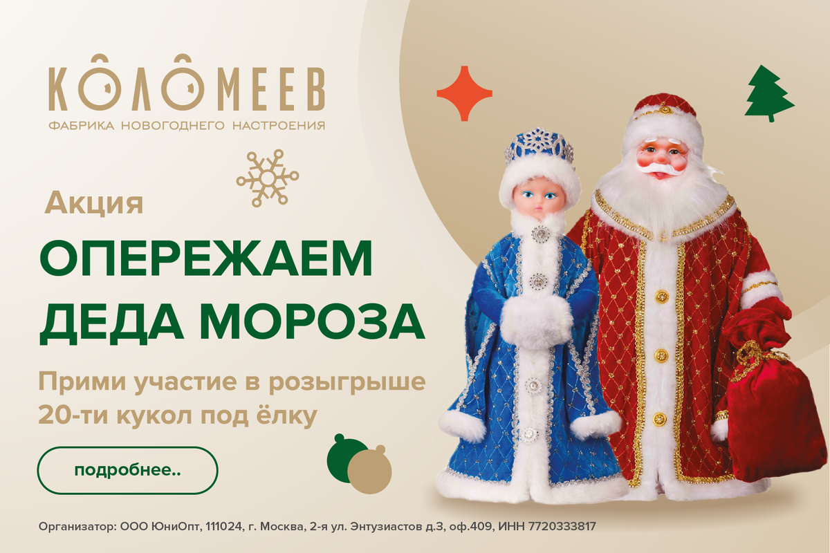 Друзья, мы к вам с хорошими новостями! Объявляем о старте нашей ежегодной акции #Опережаем_Деда_Мороза , которая уже стала приятной предновогодней традицией! При покупке любой ёлочной игрушки Фабрики новогоднего настроения «КОЛОМЕЕВ» вас будет ждать приятный бонус – возможность выиграть одну из двадцати кукол под ёлочку (Дед Мороз или Снегурочка). Акция проходит с 15.10.2024 по 24.12.2024, результаты розыгрыша подведем 25 декабря. С правилами участия и подробностями проведения акции можно ознакомиться на сайте https://kolomeev.ru/action Организатор акции ООО "ЮниОпт", ИНН 7720333817, erid: 2VtzqxkwfT8