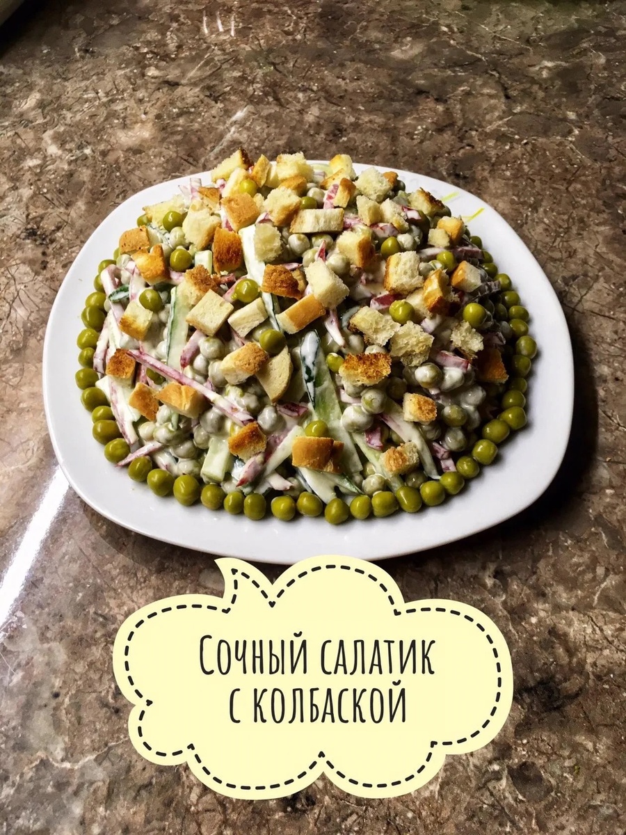 Салатик… очередной. ✅Сочный ✅Свежий ✅Вкусный 👩🏻🍳Ингредиенты: Колбаса сырокопченая Зелёный горошек Огурцы свежие Сухарики Майонез Соль и перец по вкусу 👩🏻🍳Приготовление: Огурцы и колбасу порезать соломкой и отправить в салатник. Далее добавляем зелёный горошек (жидкость хорошо слить). Добавить сухарики (можно посушить самостоятельно из батона в духовке или на сковороде). Все заправить майонезом, посолить и поперчить по вкусу. Тщательно перемешать салат. По желанию можно украсить. Приятного всем!!