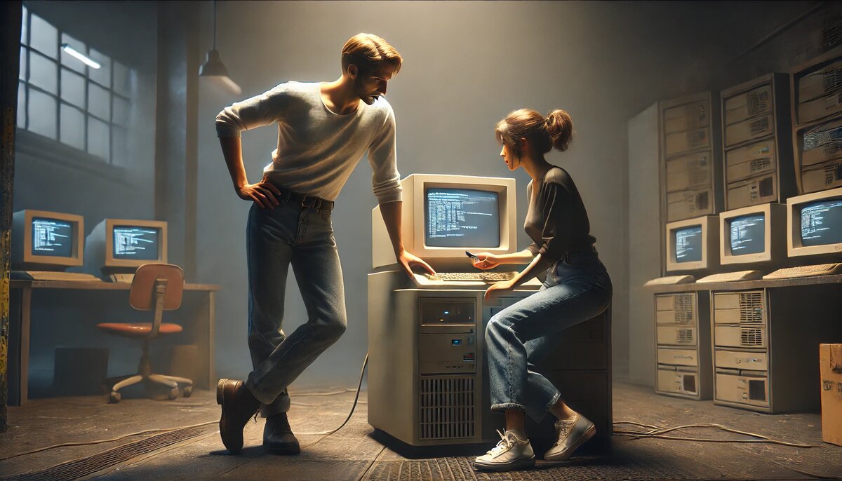 Сергей подошёл к старому терминалу, и Алина начала подключать флешку.