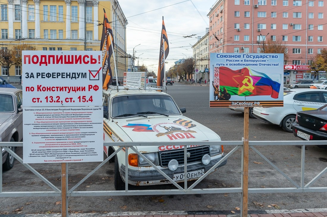 01. Выхожу из такси и сразу попадаю с корабля на бал: на базе старой "Волги" стоит передвижной штаб НОДовцев, которые агитируют за союз с Белоруссией и требуют независимости Владимира Владимировича. Если вы не знали, эти странные люди с георгиевскими ленточками требовали изменить Конституцию, чтобы Путин перестал быть марионеткой США и наконец навёл порядок в стране. Да, по мнению этих людей, президент у нас не самостоятельный и не может сам принимать решения, поэтому России срочно нужен суверенитет.