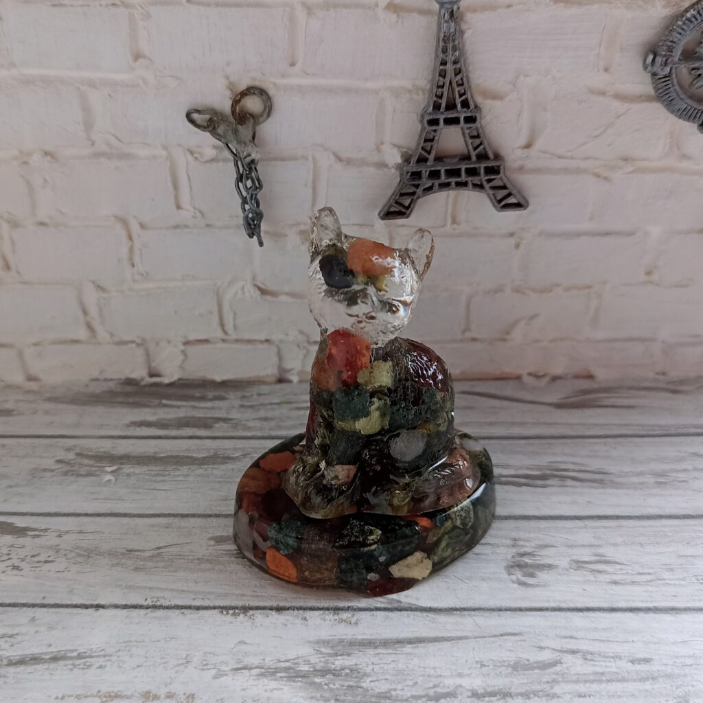 Статуэтка Кошка на подставке выполнена из россыпи натуральных камней и эпоксидной смолы. Кошечка из змеевика, мрамора, красной яшмы, доломита, фельзита, златолита. Подставка выполнена из змеевика и мрамора. 🐈 Кошка является символом гармонии и умиротворенности, выступая в роли талисмана, который защищает домашний уют, а также служит оберегом для женщин. Кошка: Подставка: