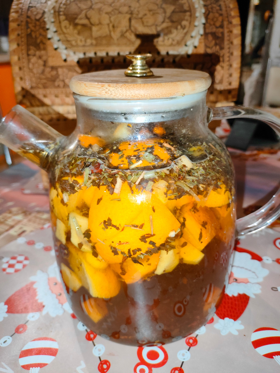 Возвращались с работы, и взял ВВ пунш с имбирём и цитрусовыми. Вкусно, но 135 р за стаканчик...Что ж, нужно было творить очередную отсебятину. И так, на заварник 600-700 мл беру полторы столовых ложки чая, у меня черный с травами, поэтому если берёте простой чёрный, на мой взгляд стоит уменьшить до 3/4 столовых ложки. Щепотка молотой смеси перцев. Сахар либо мёд, или, как моем случае, сироп топинамбура - по вкусу. Один лимон, один апельсин, моем, не очищая на кусочки. Корень имбиря, небольшой, очищаем, нарезаем мелкими кусочками. Всё это в чайник, завариваем кипятком, даём настояться минут 15, можно пить. Я лично заливала смесь полностью ещё два раза, всё равно было вкусно. При этом мне чай зашёл и холодным. А так... очень хороший, вкусный и яркий напиток для сезона холодов. А ещё и полезный 😉
