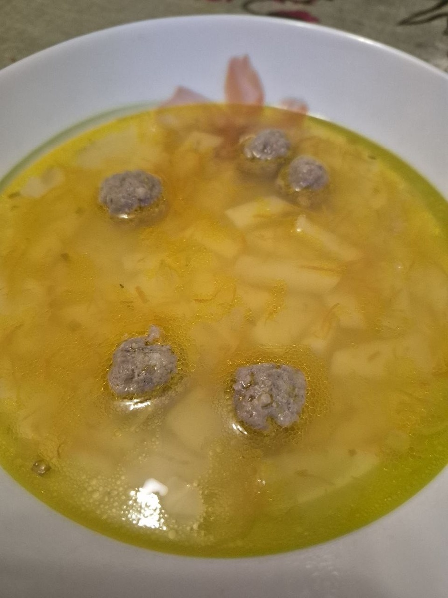 - соль, перец по вкусу Фарш солим и перчим по вкусу, все тщательно перемешиваем. Из фарша лепим маленькие шарики (фрикадельки). Лук режем мелким кубиком, морковь натираем на мелкой терке, картофель режем средним кубиком. В кастрюлю заливаем воду (примерно на 2/3 объема), кипятим и в кипящую воду засыпаем наши фрикадельки, снимаем пену, варим минут 10. Лук обжариваем на сковороде до золотистого цвета, добавляем морковь, жарим до полуготовности моркови. Полученную зажарку добавляем в кастрюлю. Варим минут 10. Добавляем картофель. Варим еще примерно 20 минут. Наш суп готов! Приятного аппетита!